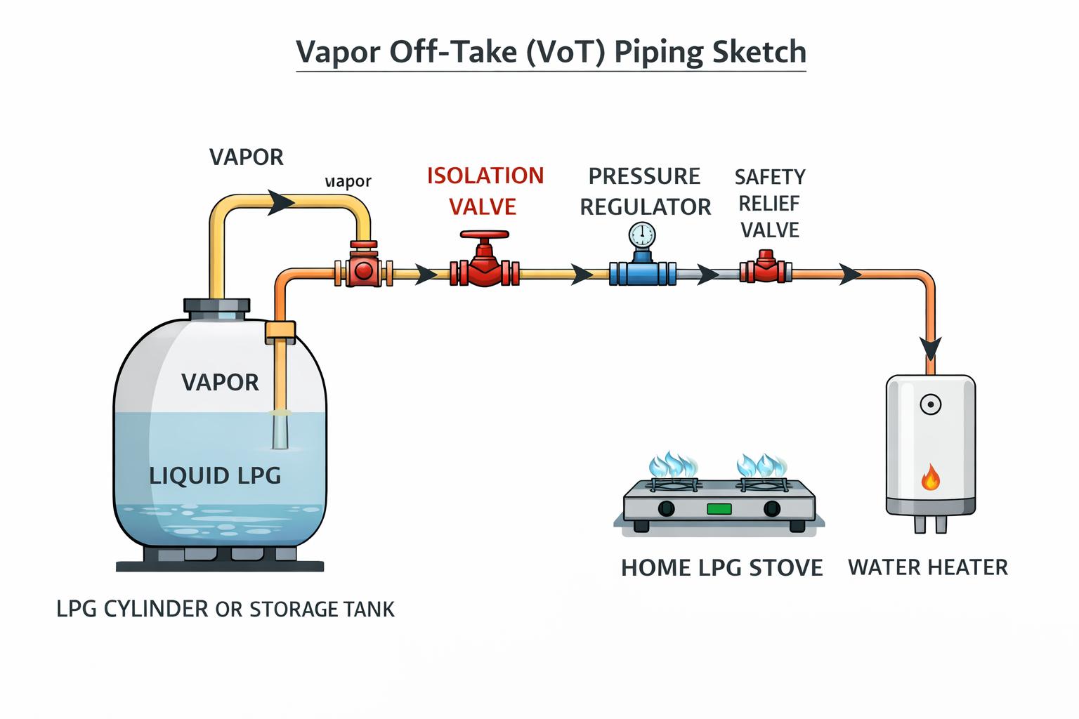 VoT (Vapor Off-Take) is ideal for small, low-demand LPG consumption, using natural vapor pressure—simple, economical, but limited in capacity and not suitable for industrial-scale operations.